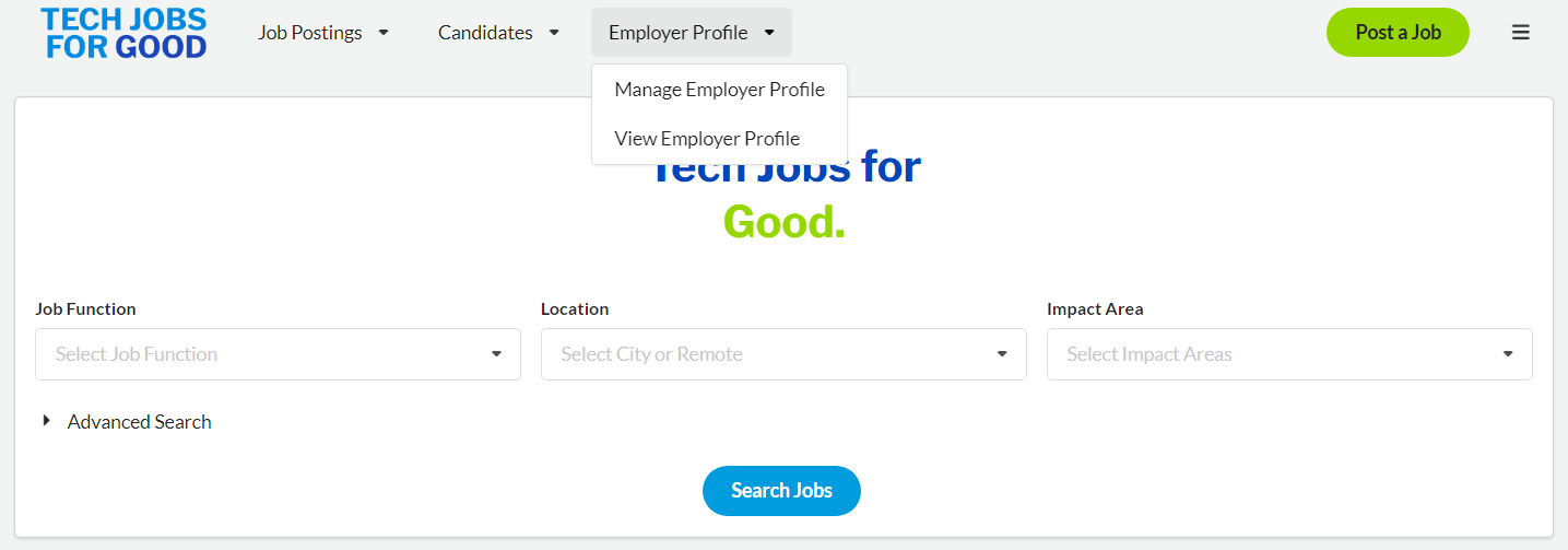 Once you're logged in, navigate to the Employer Profile menu at the top of your screen and click Manage Employer Profile. You can also get there using this link.